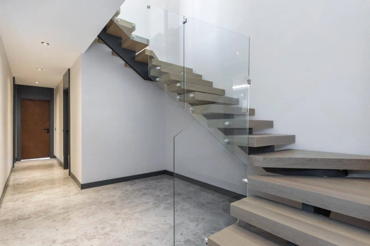 Прямая лестница, окружённая стенами: Такая лестница для узких проходов или коридоров — незаменимое решение. Лестница плотно интегрируется в архитектуру дома, а ощущение монолитности конструкции добавляет надежности и сдержанной эстетики.