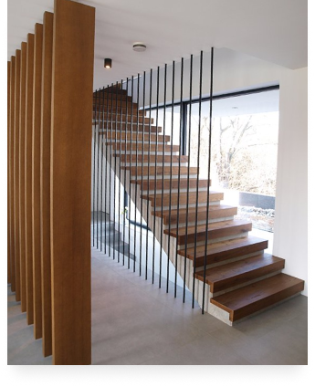 Основа лестницы: Деревянная отделка одинаково хорошо подходит как для бетонных, так и для металлических лестничных конструкций. Отделка бетонной лестницы подчеркивает геометрию, придаёт поверхности завершённый вид и увеличивает срок службы конструкции. Отделка металлической лестницы позволяет скрыть холод металла, улучшить акустику шага и создать гармоничный, эстетически привлекательный внешний облик для современных и классических интерьеров.